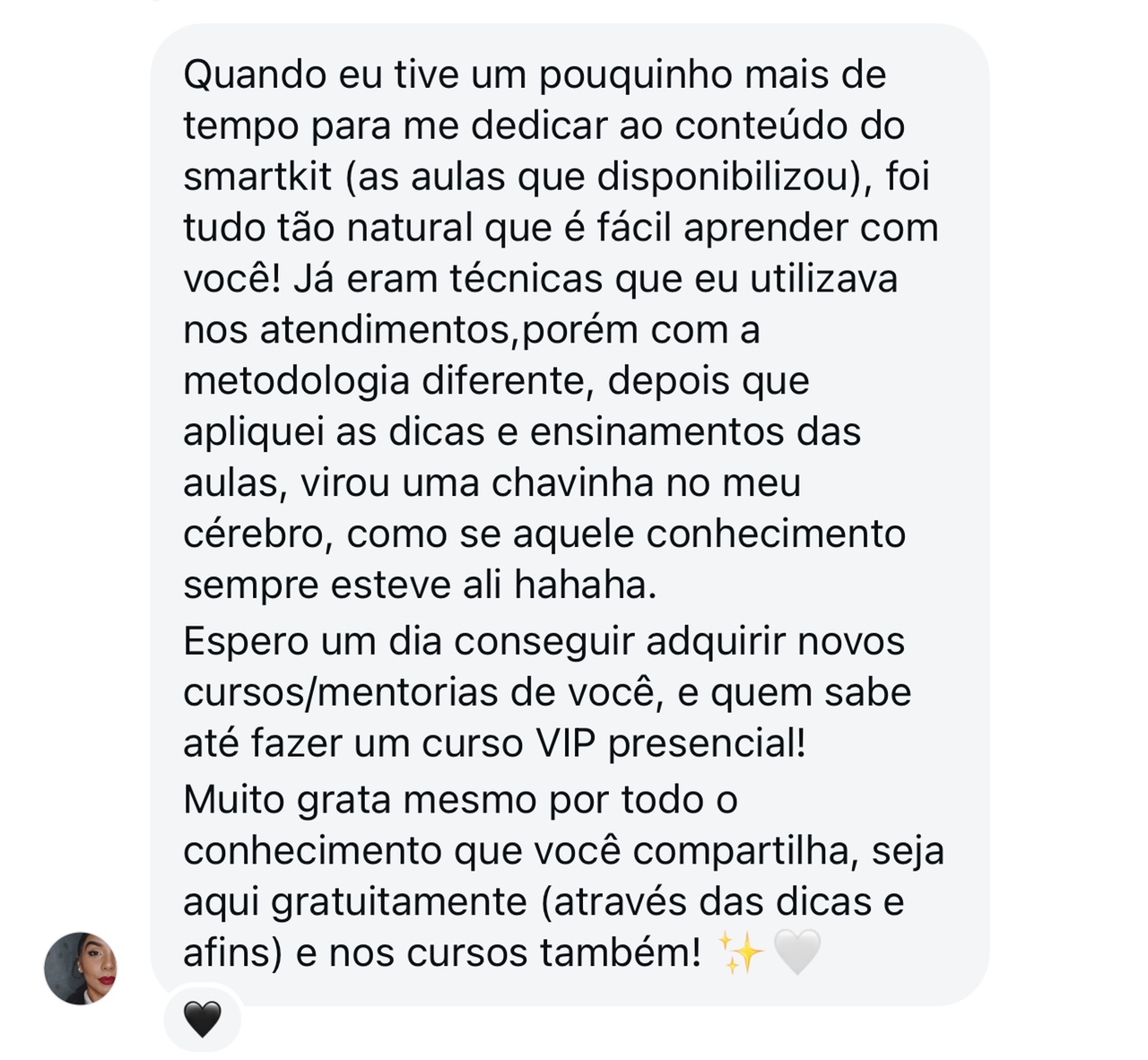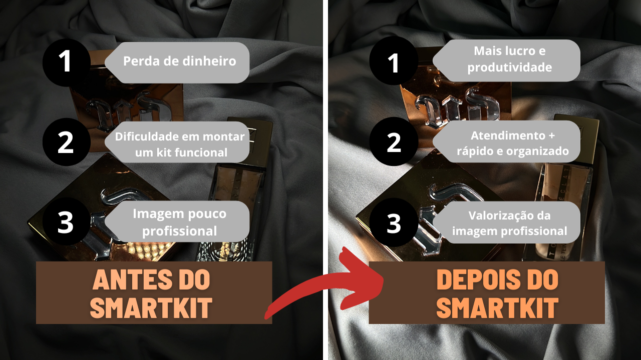 Se você está começando o Smarkit é ainda mais valioso! Ele te impede de comprar produtos por impulso ou por modismo. Com ele você já começa investindo certo, montando um kit profissional enxuto e eficiente. Isso te dá mais segurança para atender clientes e evoluir suas técnicas sem gastar além do necessário.